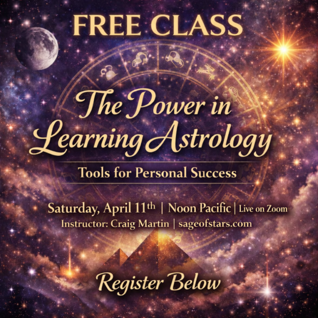 Taught by Craig, astrologer and founder of Los Angeles Astrology School, with over 30+ years of experience. This class is Live by Zoom. The next start date for this class is May 9, 2026, Saturdays, at 10:30am pacific. The class is taught in 6 parts once a week on a weekly basis. Each class is one hour. After registering, you will be personally contacted by the instructor. A zoom link, course handouts, and reading recommendations will be forwarded to you. The dates for this class are May 9, 16, 23, 30 & June 20, 27