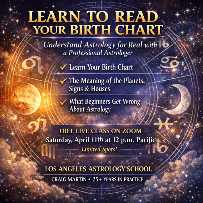 Taught by Craig, astrologer and founder of Los Angeles Astrology School, with over 30+ years of experience. This class is Live by Zoom. The next start date for this class is May 9, 2026. The class is taught in 6 parts once a week on a weekly basis. Each class is one hour. After registering, you will be personally contacted by the instructor. A zoom link, course handouts, and reading recommendations will be forwarded to you. The dates for this class are May 9, 16, 23, 30 & June 20, 27